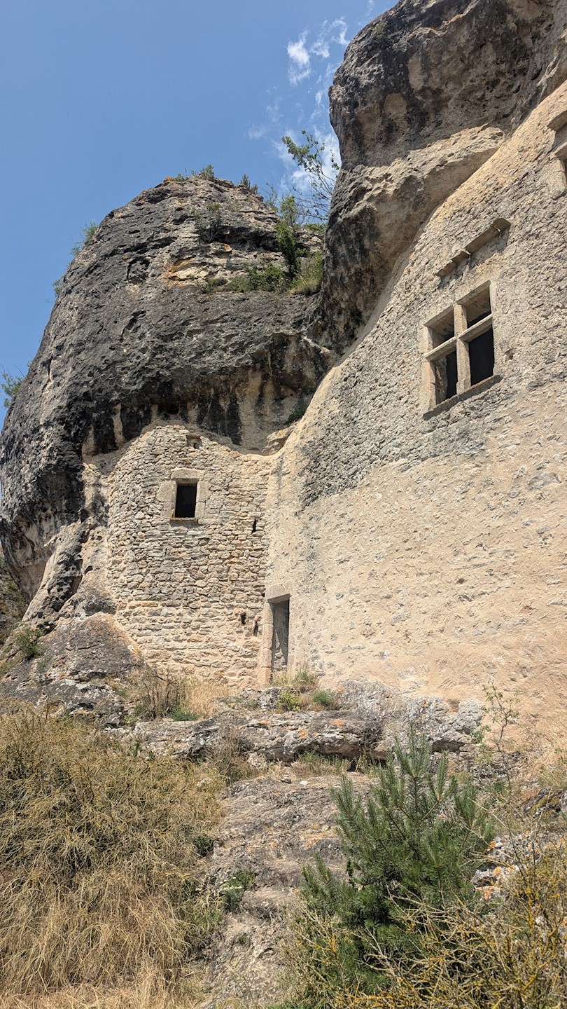 Un peu plus loin, au détour du sentier, nous nous arrêtons à la ferme troglodytique des Baumes. Son auvent rocheux qui domine le hameau a été partiellement muré pour servir de résidence, sans doute dès le XVIe siècle.