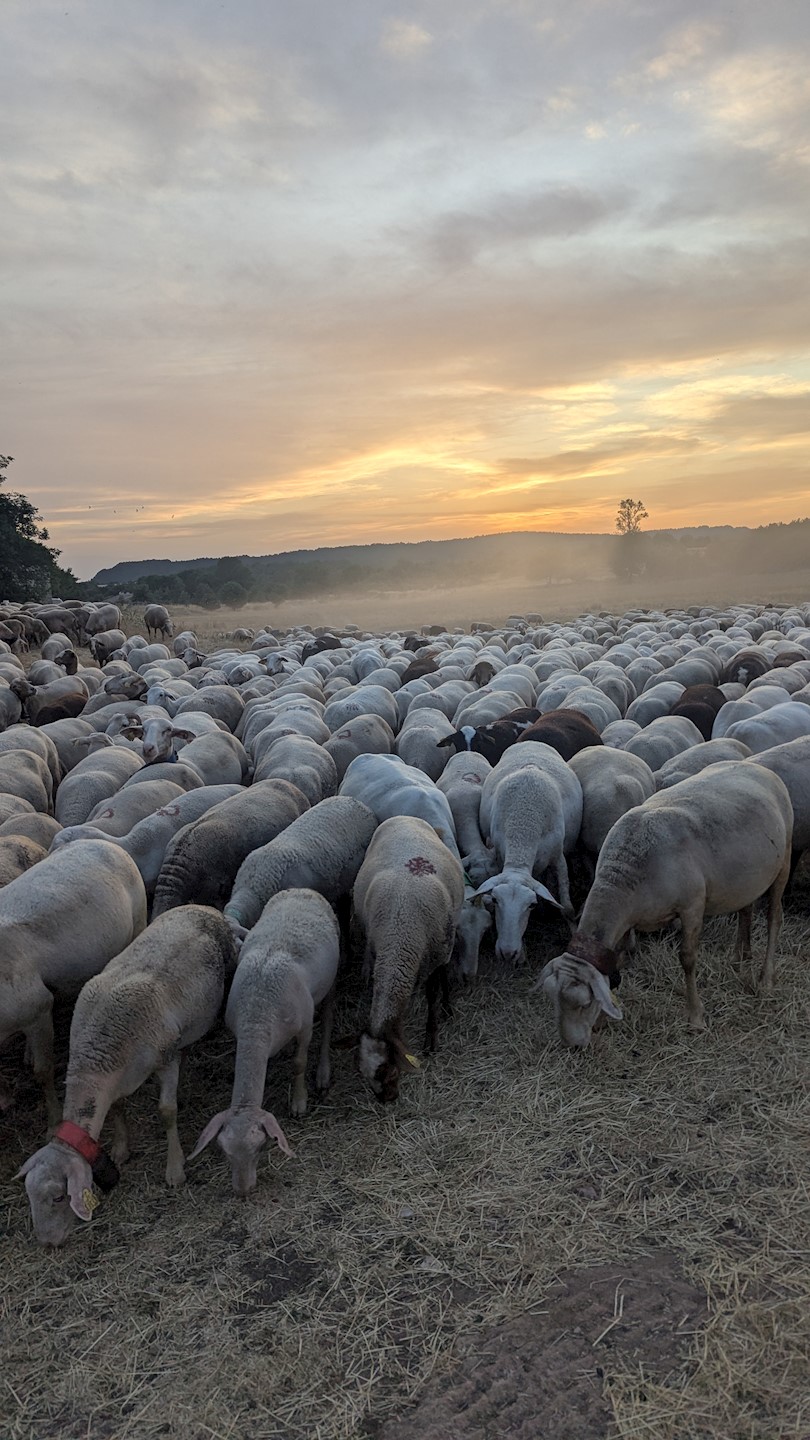 Nous entendons des clochettes, plus bas, un immense troupeau progresse dans le vallon. Nous décidons de le rejoindre. Dans un champ, nous rencontrons Marc, berger itinérant, il garde plus de 1000 têtes. Nous retrouvons les brebis aux portes de leurs bergeries. Le soleil se couche sur le troupeau, le Larzac, terre d'agropastoralisme, nous offre un moment sublime.