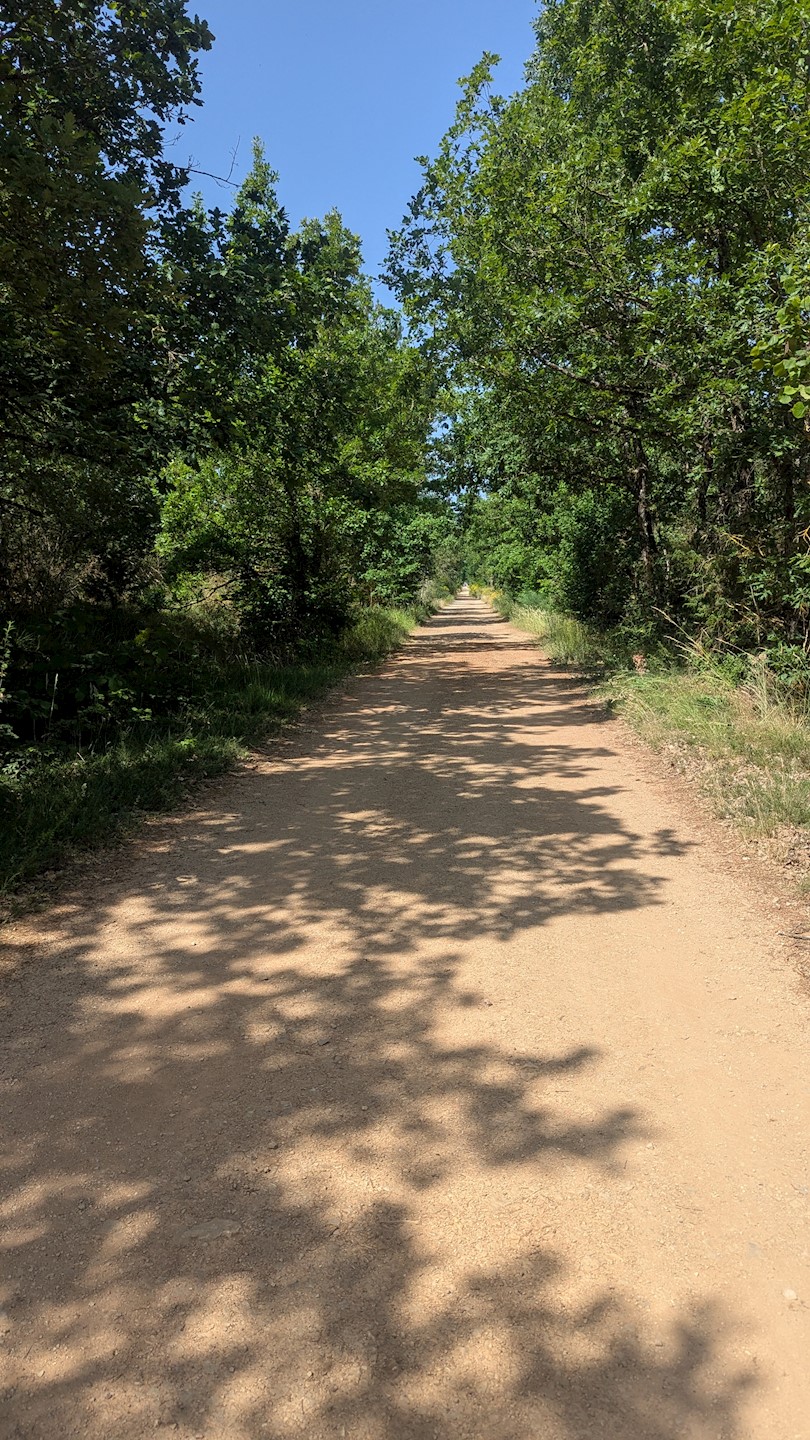 Je l'avais lu, elle est là, devant nous, droit devant (sur le Larzac, route et sentiers sont souvent rectilignes) cette ancienne voie ferrée qui reliait Le Vigan à Tournemire en escaladant les contreforts du Larzac. Nous voilà donc "en train" de cheminer sur le tracé du chemin de fer pendant 3 kilomètres. Le soleil est de plomb, le moral d’acier, il nous faut avancer, nous oscillons de droite à gauche, à la recherche de l’ombre.