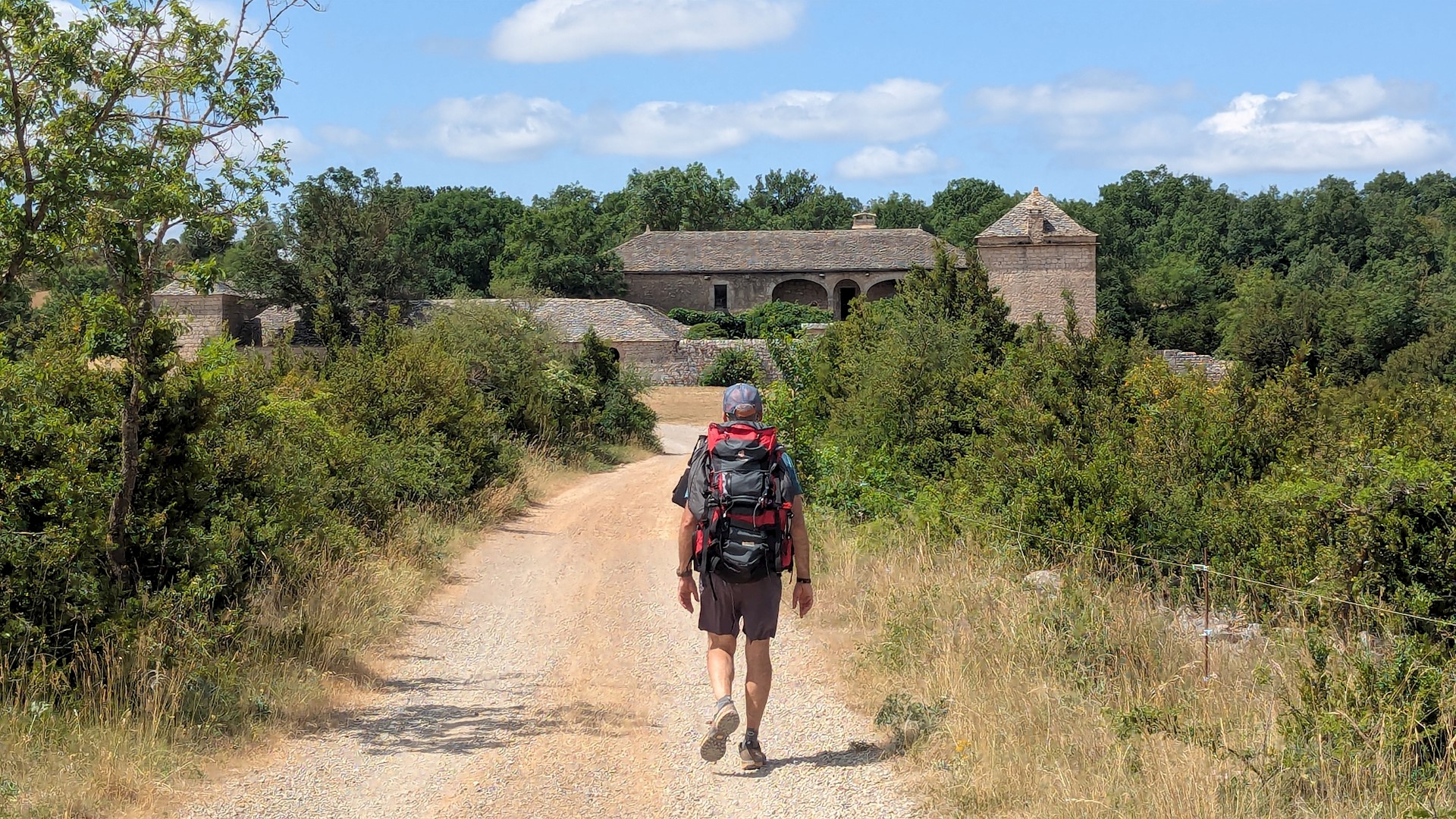 Après avoir traversé une forêt de pins illuminée par le soleil levant, nous atteignons le chaos ruiniforme des Anouts, puis le merveilleux hameau de Montredon, fief de José Bové et lieu emblématique du Larzac. Pour notre première pause, nous profitons de la table commune qui, sous les arbres, fait face au pré qui accueille, depuis plus de 30 ans, tous les mercredis en été (à partir de 18 heures) un marché paysan. A cette occasion, une librairie (La brebis qui lit) prend ses quartiers d’été dans une bergerie.